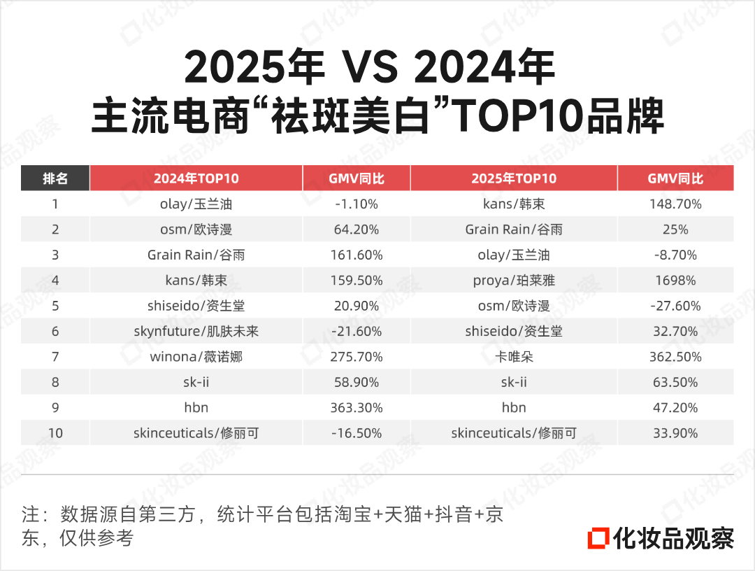 卡唯朵首次入榜。不同于2024年头部国货与外资大牌两雄争霸的局面,2025年TOP10榜单闯入一个白牌——卡唯朵以362.5%的增速跻身TOP7,将sk-ii、修丽可甩在了身后。