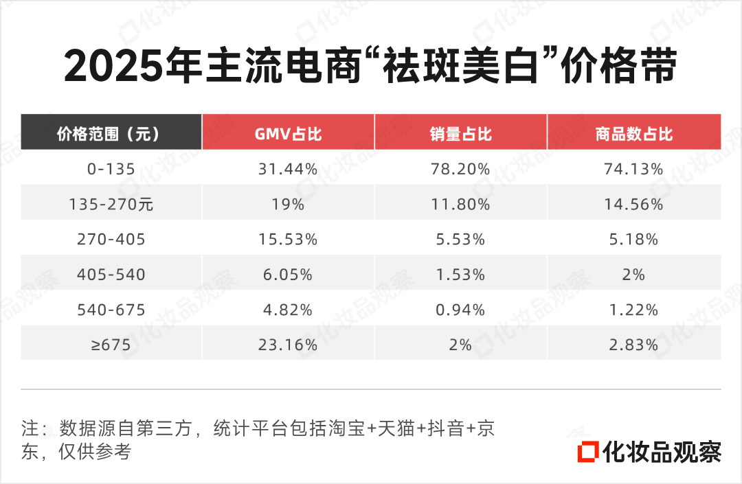 据第三方数据,2025年祛斑美白类目的价格带,呈现出典型的“两头大、中间细”的哑铃型结构:低端市场(0-135元)和高端市场(≥675元)分别贡献了31.44%、23.16%的销售额,而405-675元的中高端价格带目前占比仅10.87%,销量占比不足2.5%,呈现“空心化”状态。