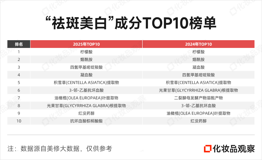 而在成分层面,柠檬酸、烟酰胺、依克多因和凝血酸、积雪草提取物稳居前五,构成美白配方的基本盘。值得关注的是,抗坏血酸棕榈酸酯异军突起——作为维生素 C的亲脂性衍生物,其兼具高稳定性与亲脂渗透性,完美克服了原型VC易氧化、透皮差的局限,成为榜单上的新星。