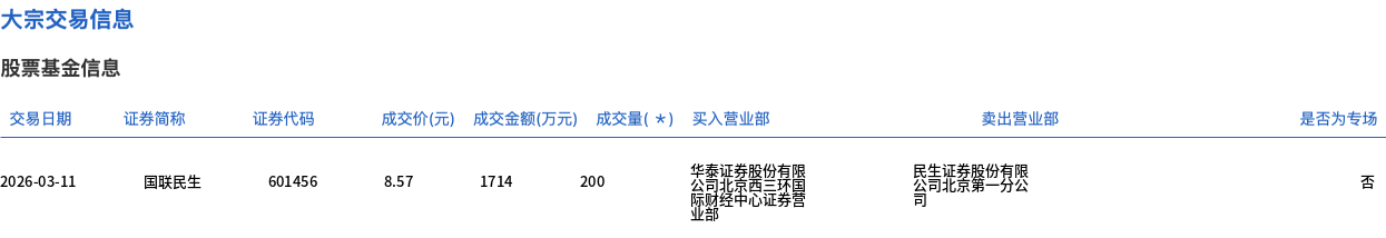 3月11日,国联民生大宗交易成交700万股,成交额5999万元,占当日总成交额的22.43%,成交价8.57元,较市场收盘价9.5元折价9.79%。