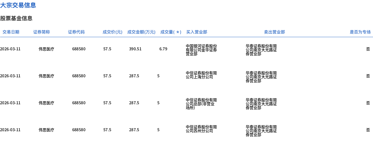 3月11日,伟思医疗大宗交易成交21.79万股,成交额1253.01万元,占当日总成交额的4.48%,成交价57.5元,较市场收盘价62.5元折价8%。