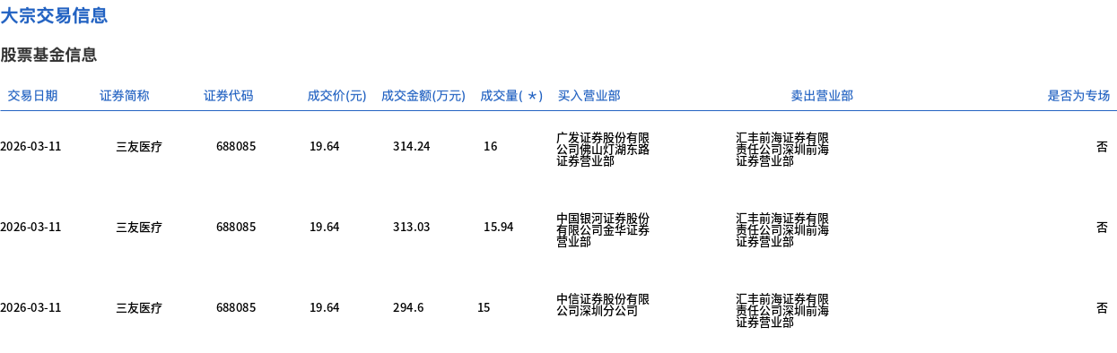 3月11日,三友医疗大宗交易成交46.94万股,成交额921.87万元,占当日总成交额的10.48%,成交价19.64元,较市场收盘价21.08元折价6.83%。