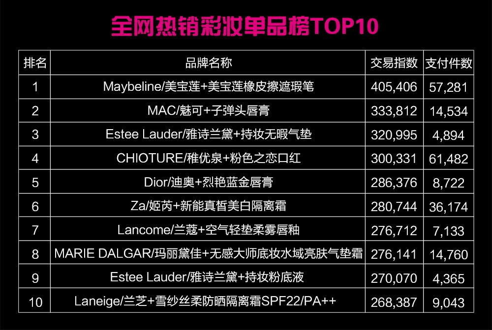 全网热销彩妆单品榜TOP10分别是Maybeline/美宝莲+美宝莲橡皮擦遮瑕笔、MAC/魅可+子弹头唇膏、Estee Lauder/雅诗兰黛+持妆无暇气垫、CHIOTURE/稚优泉+粉色之恋口红、Dior/迪奥+烈艳蓝金唇膏、Za/姬芮+新能真皙美白隔离霜SPF26/PA++、Lancome/兰蔻+空气轻垫柔雾唇釉、MARIE DALGAR/玛丽黛佳+无感大师底妆水域亮肤气垫霜、Estee Lauder/雅诗兰黛+持妆粉底液、Laneige/兰芝+雪纱丝柔防晒隔离霜SPF22/PA++。