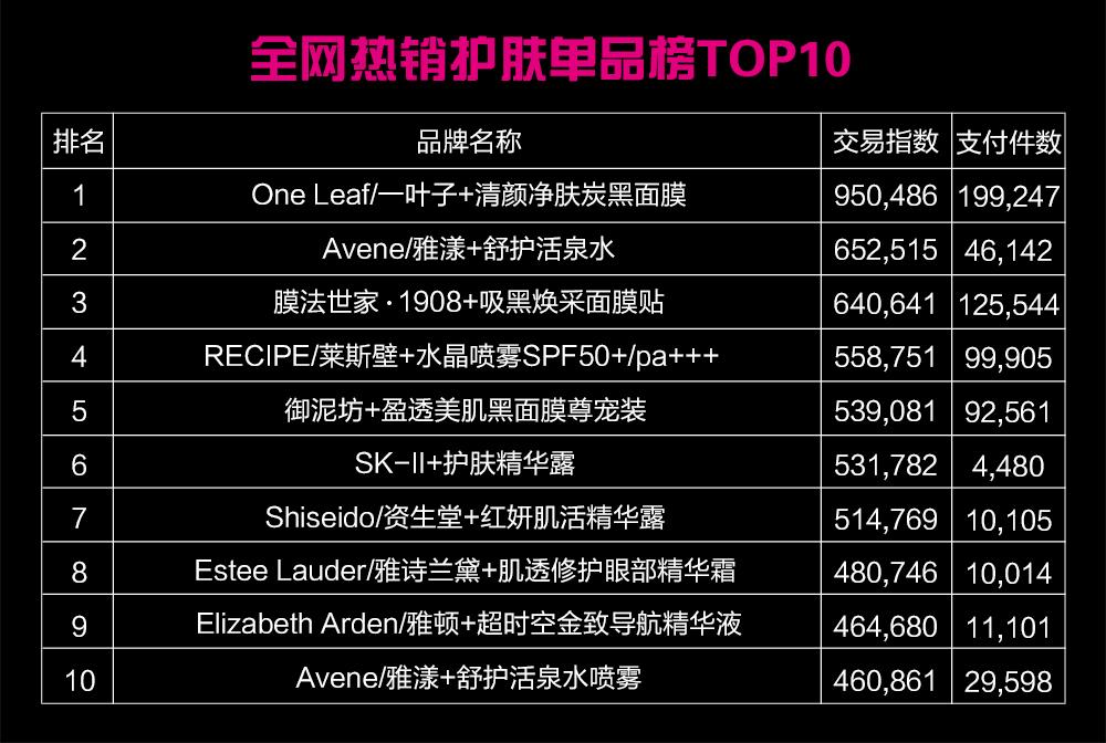 618当天,全网热销护肤单品榜TOP10分别是One Leaf/一叶子+清颜净肤炭黑面膜、Avene/雅漾+舒护活泉水、膜法世家·1908+吸黑焕采面膜贴、RECIPE/莱斯壁+水晶喷雾SPF50+/pa+++、御泥坊+盈透美肌黑面膜尊宠装、SK-II+护肤精华露、Shiseido/资生堂+红妍肌活精华露、Estee Lauder/雅诗兰黛+肌透修护眼部精华霜、Elizabeth Arden/雅顿+超时空金致导航精华液、Avene/雅漾+舒护活泉水喷雾 。