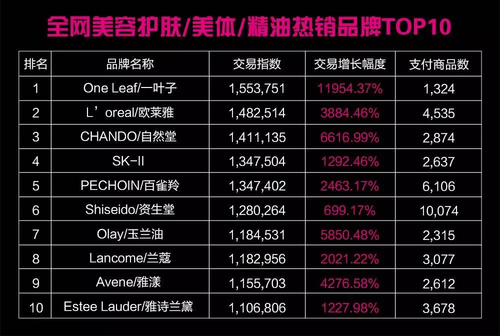 全网美容护肤/美体/精油热销品牌TOP10为:One Leaf/一叶子、L’oreal/欧莱雅、CHANDO/自然堂、SK-II、PECHOIN/百雀羚、Shiseido/资生堂、Olay/玉兰油、Lancome/兰蔻、Avene/雅漾、Estee Lauder/雅诗兰黛。