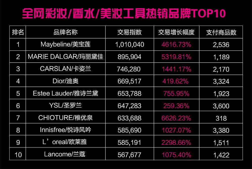 全网彩妆/香水/美妆工具热销品牌TOP10为:Maybeline/美宝莲、MARIE DALGAR/玛丽黛佳、CARSLAN/卡姿兰、Dior/迪奥、Estee Lauder/雅诗兰黛、YSL/圣罗兰、CHIOTURE/稚优泉、Innisfree/悦诗风吟、L’oreal/欧莱雅、Lancome/兰蔻。