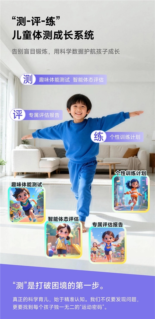 同时,系统可自动匹配“千人千面”训练方案,结合体态评估测试,早期筛查头部倾斜、脊柱侧弯等体态问题,为儿童健康成长提供科学指引(测试结果供参考,非医疗诊断依据)。