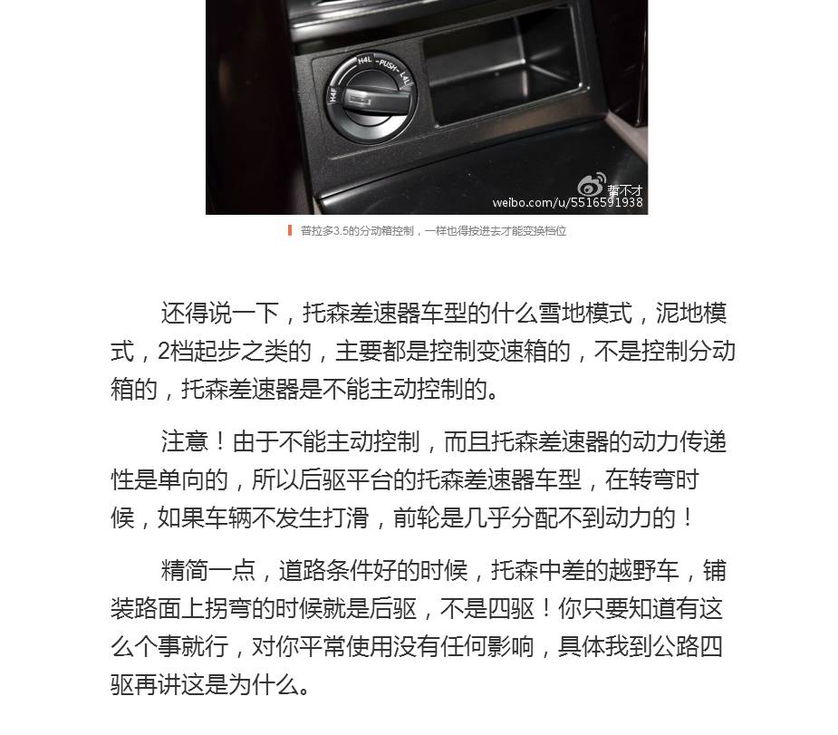所以这就是后驱平台四驱的弱点,绝大多数情况都是后桥动力强,前桥很难分配到很强的动力,为了解决这个问题,这种后驱平台的中央差速器基本都是多片离合器式的——因为多片离合器式的差速器动力传递是双向的,不是单向的。(所谓动力传递的双向性,就好比一扇可以朝内和朝外双向开的门,如果这扇门有门把手,你既可以推也可以拉,这就叫双向性;但如果这扇门只是光滑的一个平板而没有把手,你就只能推不能拉了。)