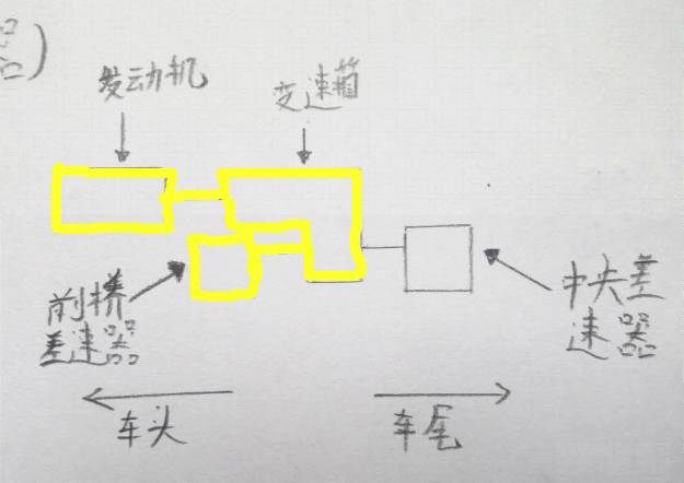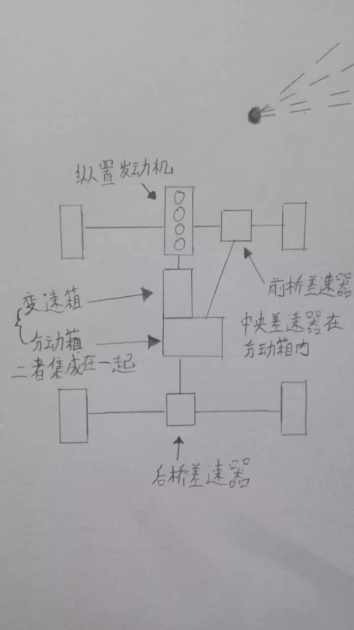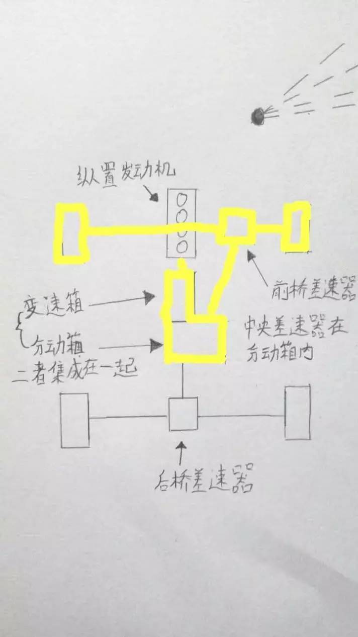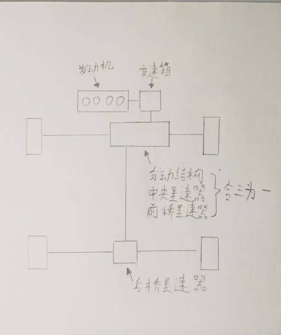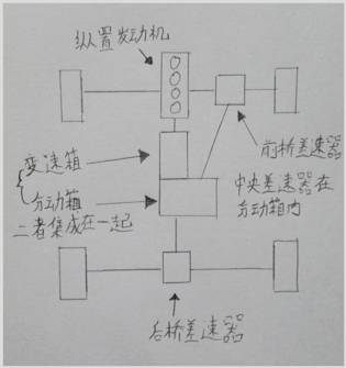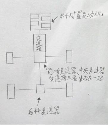 当然,我画的这个仅仅是示意图,真正的斯巴鲁变速箱、前桥差速器、中央差速器,三位一体的设计成一个壳体,节省了大量的空间,为性能和乘坐空间做出巨大的贡献。