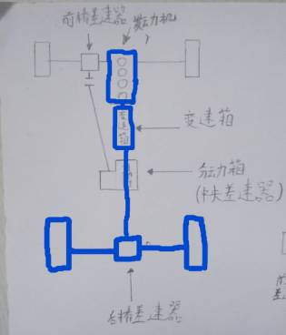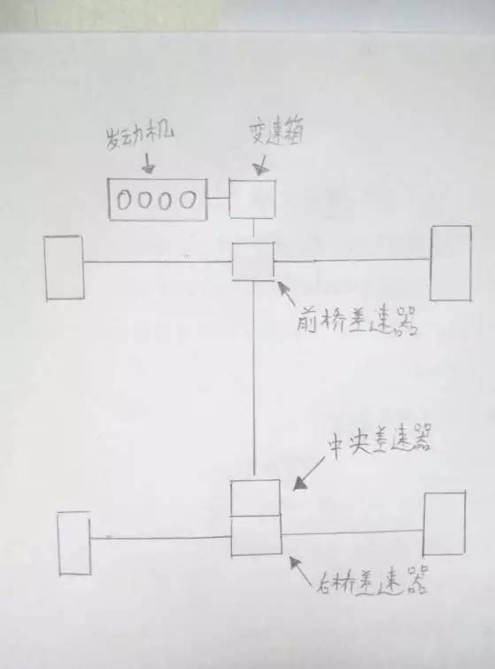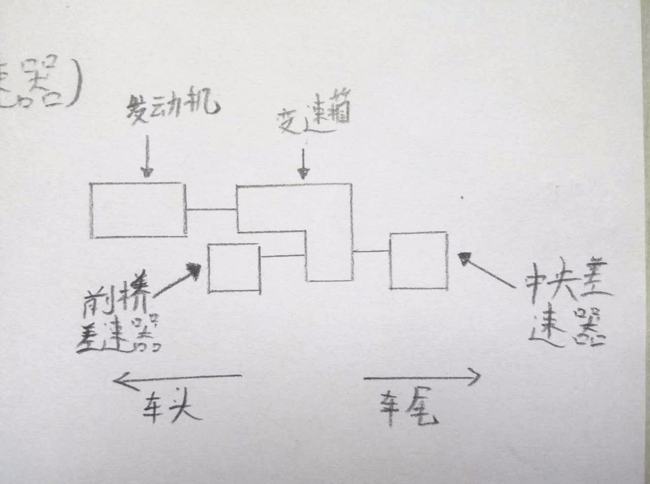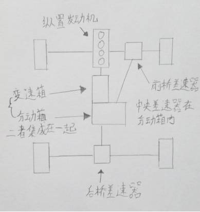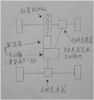 横置四驱的动力是由发动机变速箱首先先传给前桥差速器,由前桥差速器通过传动轴,传递给中央差速器,中央差速器再传递给后桥差速器。(而纵置四驱是发动机传递动力给中央差速器,中央差速器同时传递给前、后桥差速器,进而驱动车轮。)