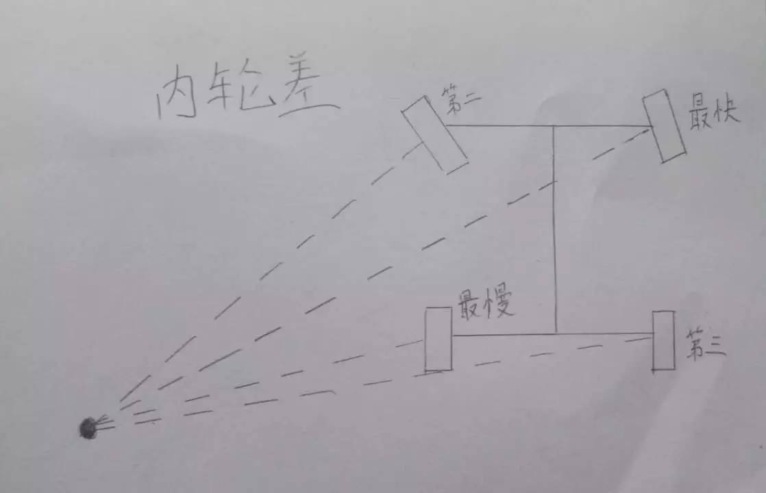 由于公路四驱防滑功能相对简单,所以着重谈公路四驱的弯道性能。而说道弯道性能,就不得不提“内轮差”这个概念。如上图所示,其实内轮差特别简单,像这样车辆左转(不打滑的情况下),右前轮转速最快,左前轮第二,右后轮第三,左后轮最慢,在转弯中前轮转速比后轮快——这其实很浅显,不过在公路四驱中这个结论特别的重要。