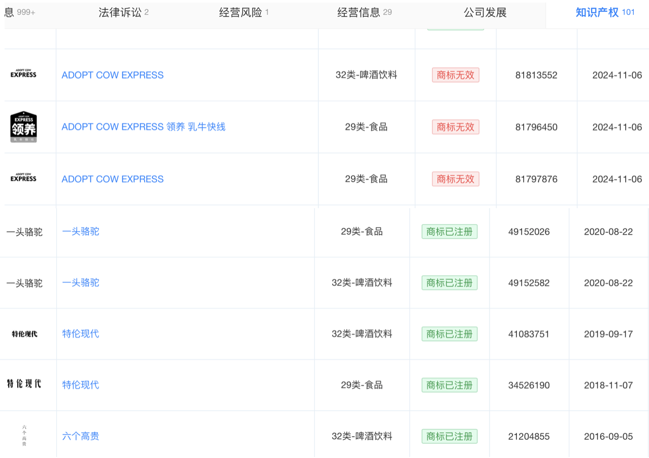 更有企业几乎在堂而皇之地山寨。一款“领养一头骆驼”的产品,明显“撞脸”“认养一头牛”,但其生产企业四川百年有机绿色食品集团有限公司直接说,“我们注册品牌了,合理合法”。天眼查APP工商资料显示,四川百年有机绿色食品集团有限公司目前注册有“认养”、“领养”、“一头骆驼”等商标,但“领养一头牛”、“领养一只羊”等商标均显示为无效商标。