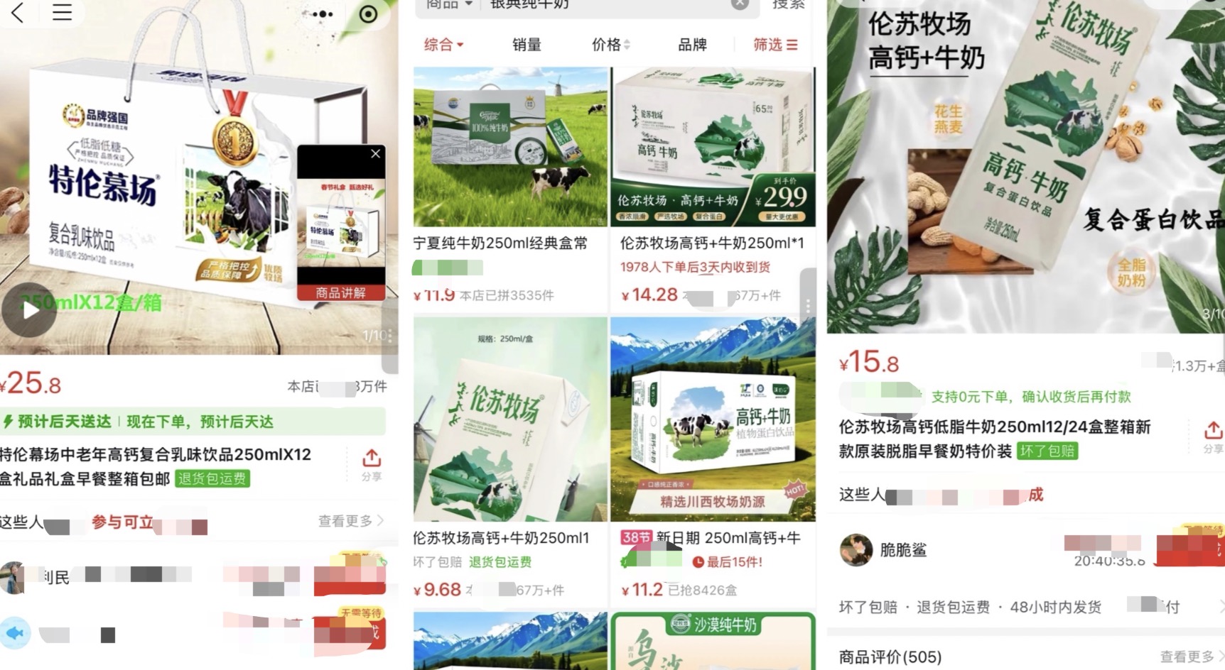 各种让人“似曾相识”的核桃露、含乳饮料不仅一搜一大把,而且销量不低。例如一箱12盒250毫升的“特伦慕场”中老年高钙复合乳味饮品的售价是25.8元,退货还包运费,截至采访当日已售1.3万件。