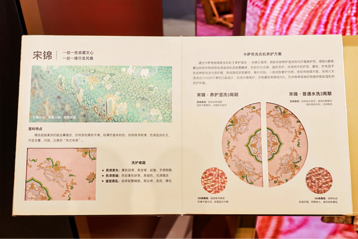 此外,卡萨帝还现场发布了全球首份“面料辞典”,不仅覆盖云锦、宋锦、蜀锦三大非遗名锦,更囊括了羊绒、真丝、亚麻、冲锋衣等日常高端面料。针对面料的纤维特性、织造工艺与专属洗护痛点,匹配了定制化的解决方案,做到每一种面料背后,都对应着一套量身打造的专属养护方案。