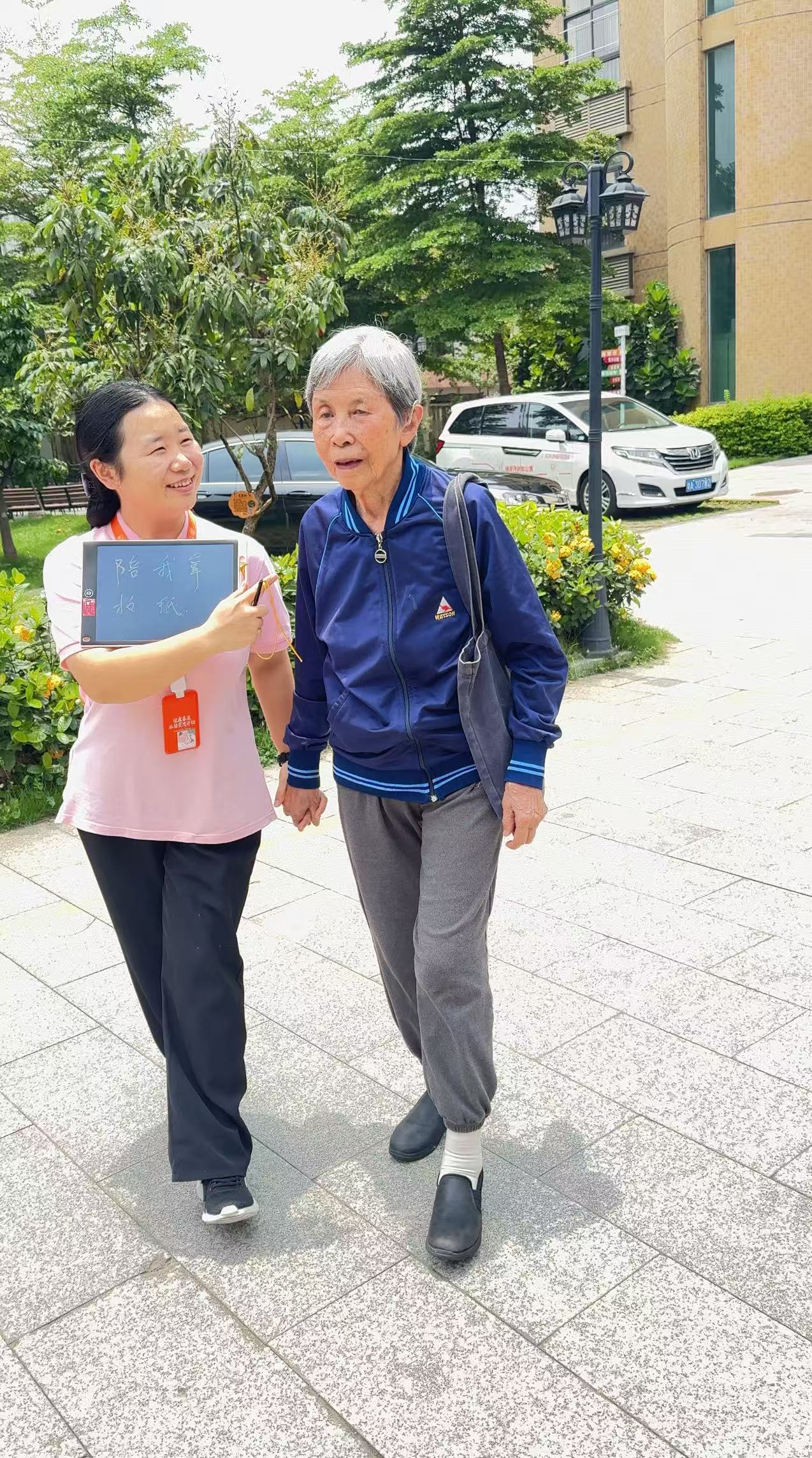 失智照护组长肖宁君接到的第一个任务,就是陪伴这位总想着外出采访的老记者。这位00后姑娘起初有些忐忑,但她很快找到了与刘老师沟通的方式:写字板、肢体语言,以及失智照护专业中最核心的能力——尊重与认同。