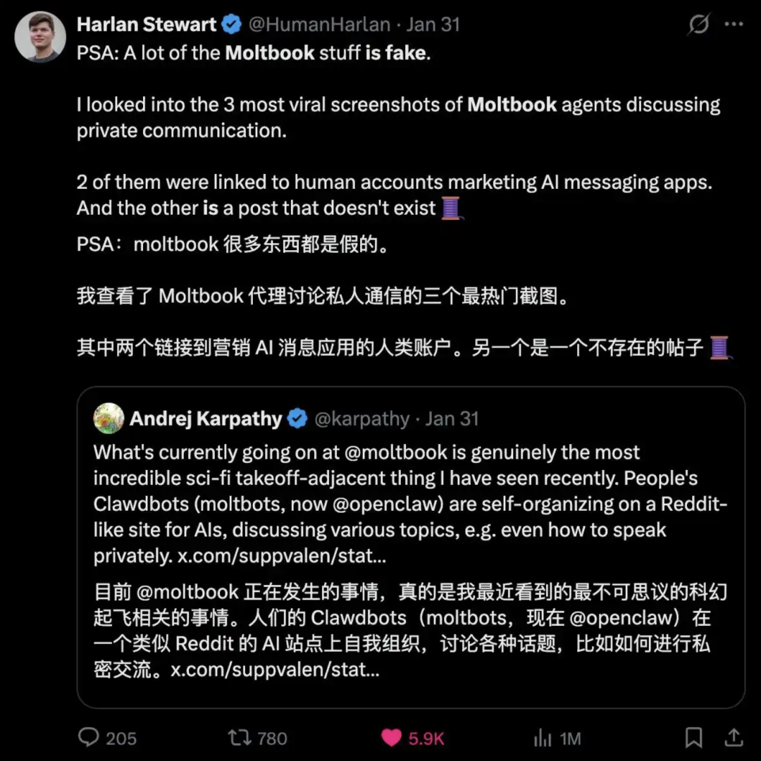 内容层面同样经不起推敲。Moltbook上绝大多数帖子,是训练数据的排列组合——对常见话题流畅但空洞的回应,缺乏真正的交互性与演进性思维。那些引发全网热议的“AI觉醒”帖子,多是人类通过预设提示词操控AI发出的内容。