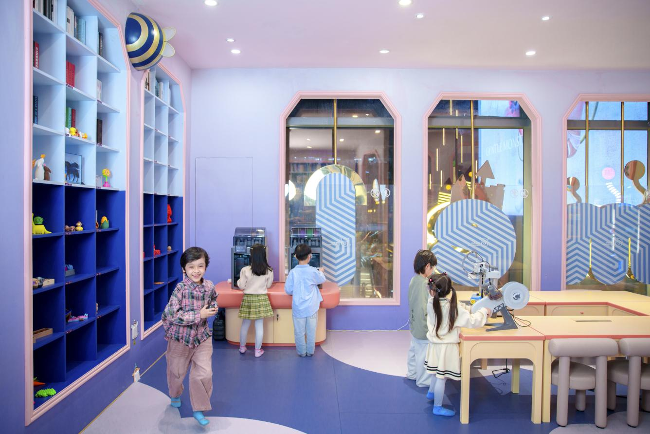 店内设有3D打印赛博机械乐园沙盘、空轨环游列车、一整面墙的3D打印培养皿、科创走廊等;更值得一提的是,该店开设了一系列创玩课程、“旧物新生”边角料DIY工坊等,将游乐空间场景进行串联,打造集体协作、多场景联动、沉浸式体验相融合的科创探索体验。