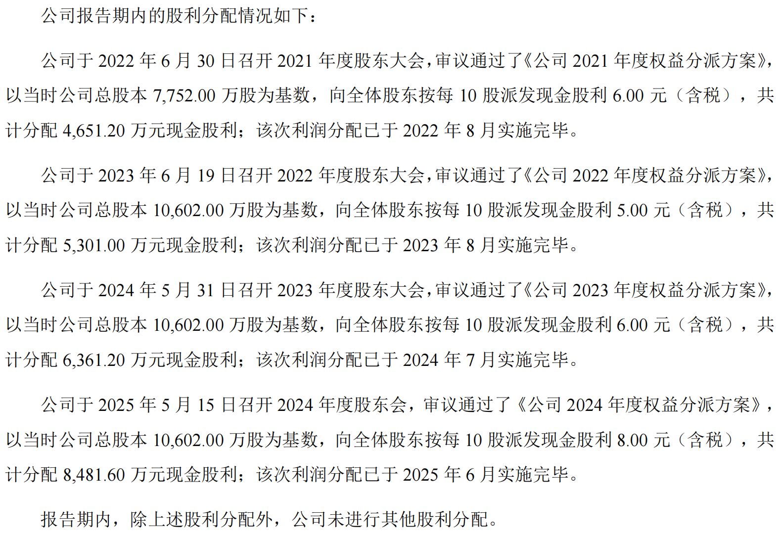 然而,在行业寒意渐浓、业绩增长乏力之际,莫森泰克的分红却显得格外“豪爽”。报告期内,公司累计进行了4次股利分配,2022年至2025年上半年分别派现4651.20万元、5301.00万元、6361.20万元和8481.60万元,合计分红约2.48亿元。