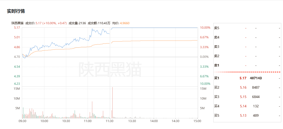 涨停价:5.17元,涨幅10.00%,首板放量涨停