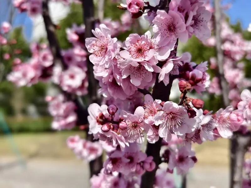 美人梅属于落叶小乔木或灌木,是由重瓣粉型梅花与红叶李杂交而成的。自然花期主要从3月开始,自上而下依次开放,最晚可达4月中旬。