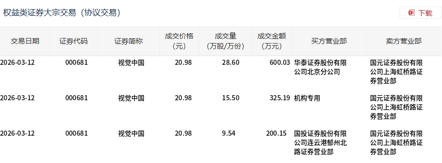 3月12日,视觉中国大宗交易成交53.64万股,成交额1125.37万元,占当日总成交额的1.97%,成交价20.98元,较市场收盘价22.8元折价7.98%。