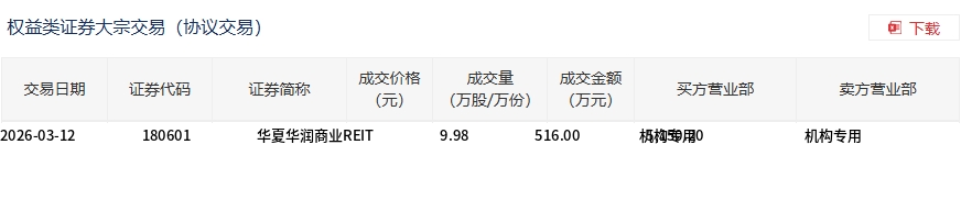 3月12日,华夏华润商业REIT大宗交易成交516万股,成交额5150.2万元,占当日总成交额的85.95%,成交价9.98元,较市场收盘价10.015元折价0.35%。