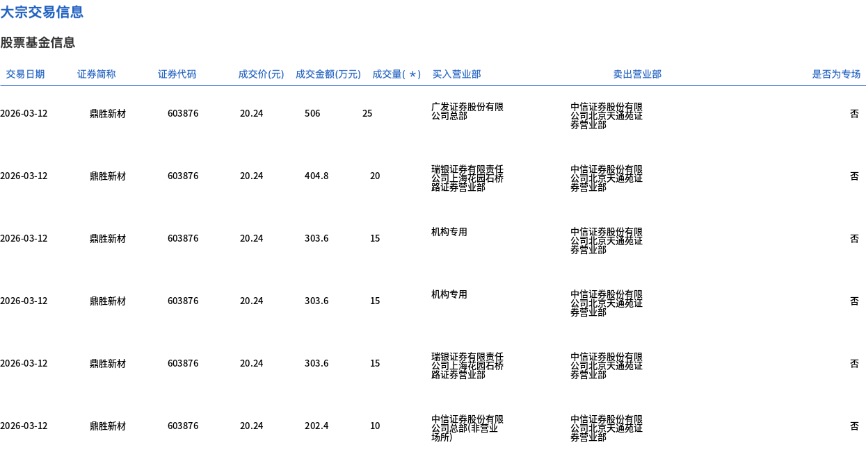 3月12日,鼎胜新材大宗交易成交140万股,成交额2833.6万元,占当日总成交额的2.84%,成交价20.24元,较市场收盘价21.53元折价5.99%。