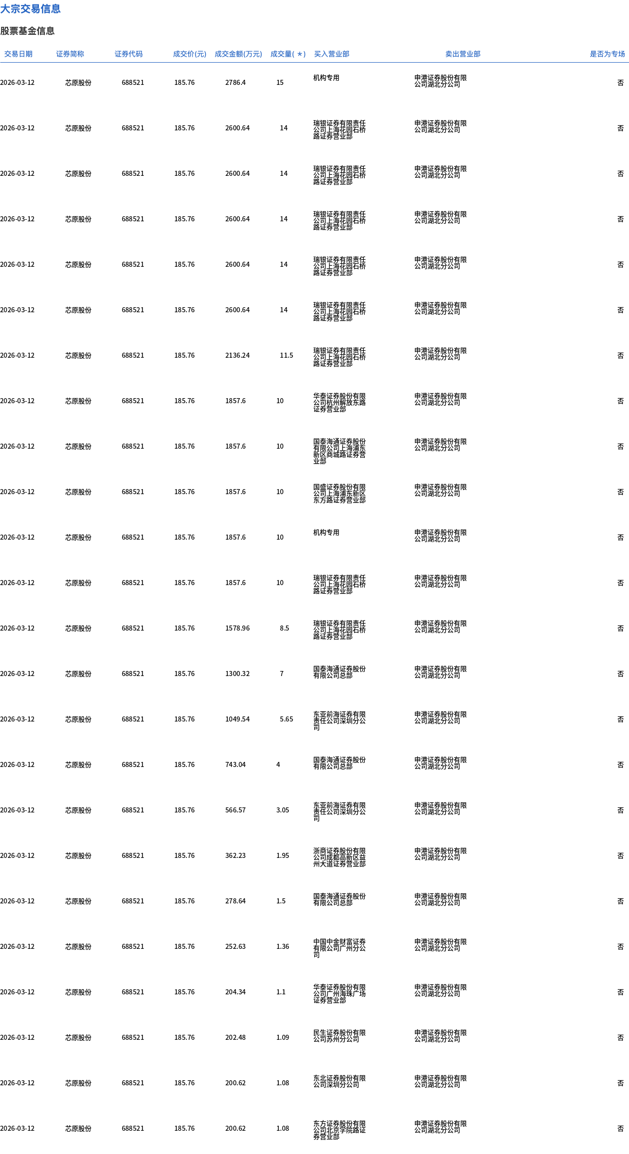 3月12日,芯原股份大宗交易成交186.02万股,成交额3.46亿元,占当日总成交额的7.06%,成交价185.76元,较市场收盘价216元折价14%。