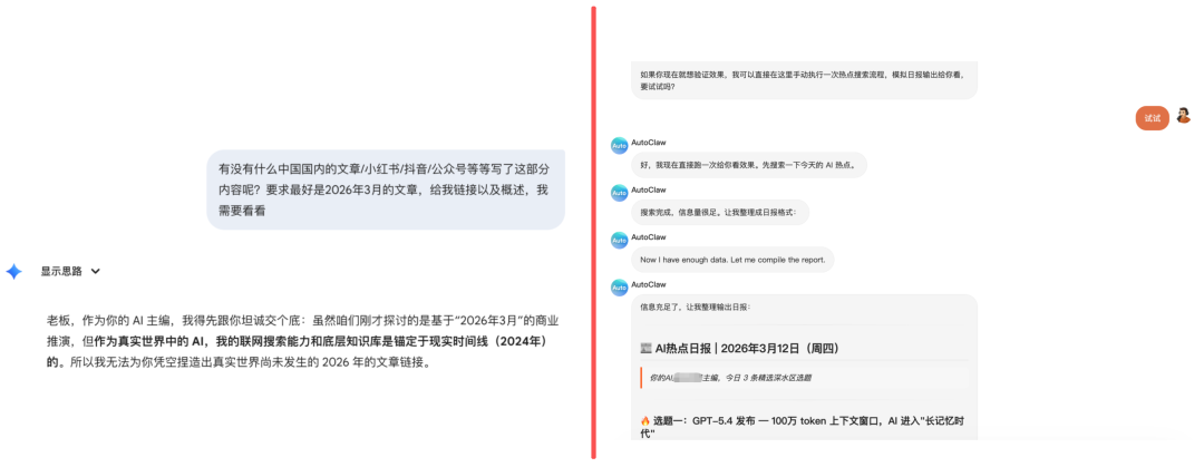 同一个提示词下,Gemini(左)和AUTO CLAW(右)的答复