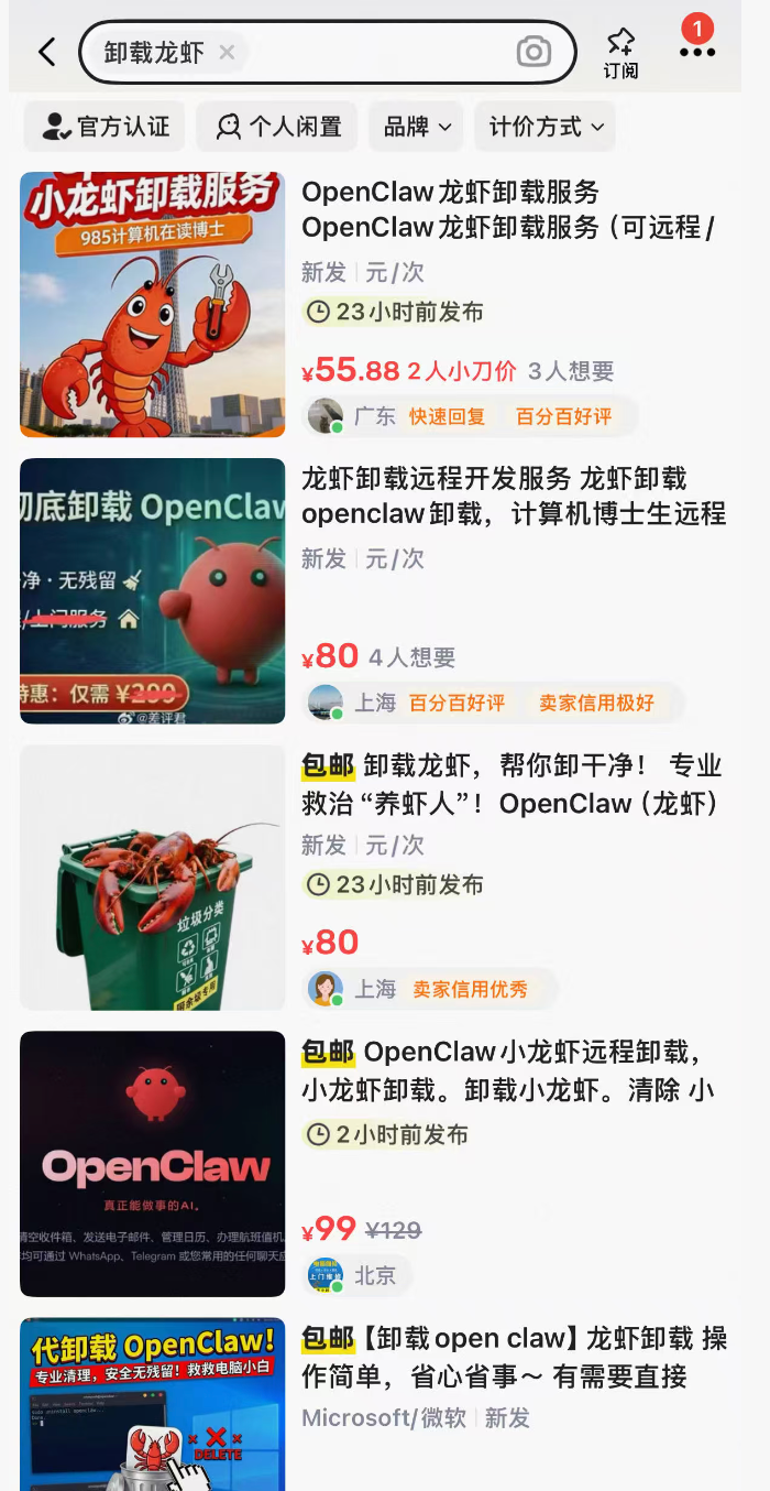 而今天,当龙虾全面暴雷,无数小白看着卡死的电脑和空空如也的钱包陷入恐慌时,你打开闲鱼,会看到极其讽刺的一幕: