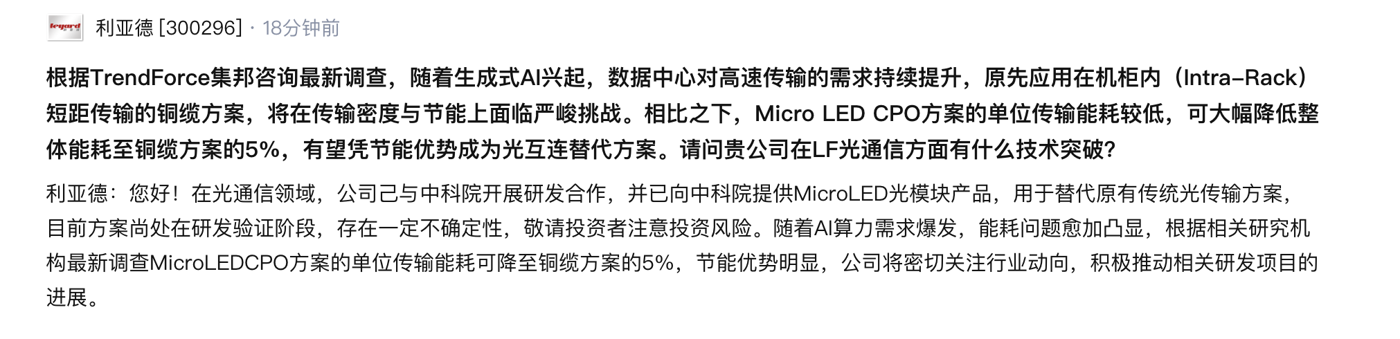 3月12日,利亚德在互动平台表示,在光通信领域,公司己与中科院开展研发合作,并已向中科院提供MicroLED光模块产品,用于替代原有传统光传输方案,目前方案尚处在研发验证阶段,存在一定不确定性,敬请投资者注意投资风险。随着AI算力需求爆发,能耗问题愈加凸显,根据相关研究机构最新调查MicroLEDCPO方案的单位传输能耗可降至铜缆方案的5%,节能优势明显,公司将密切关注行业动向,积极推动相关研发项目的进展。