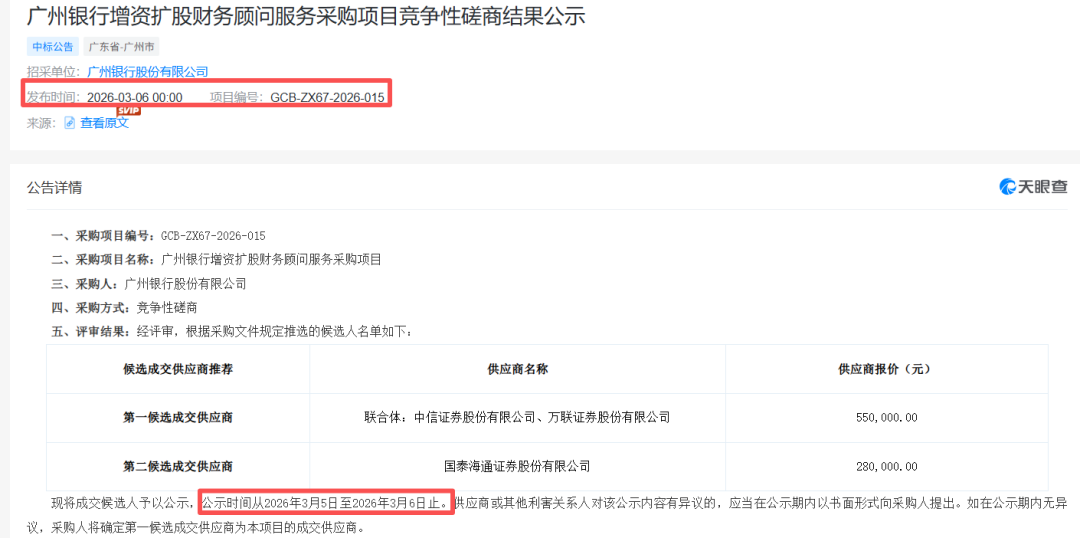 截至发稿,广州银行官网已删除三项招标公告信息,同时天眼查披露,该行增资扩股财务顾问服务采购项目已完成评审,公示了2名成交候选人。