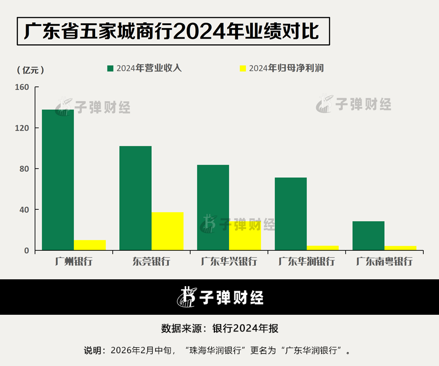「子弹财经」发现,广东省共有5家本土城商行,除了广州银行之外,截至2025年三季度末,仅东莞银行披露其营收与归母净利润分别为69.18亿元、25.46亿元。可见,广州银行的营收规模超越东莞银行。