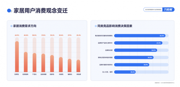 报告显示,影响家居用户购买的决策要素集中在实用性、优质服务、个性化、品质保障、体验感、智能化、功能性、创新性等方面,其中实用性仍是用户主要购买原因,占65.9%;其次是优质服务,高达40.8%。
