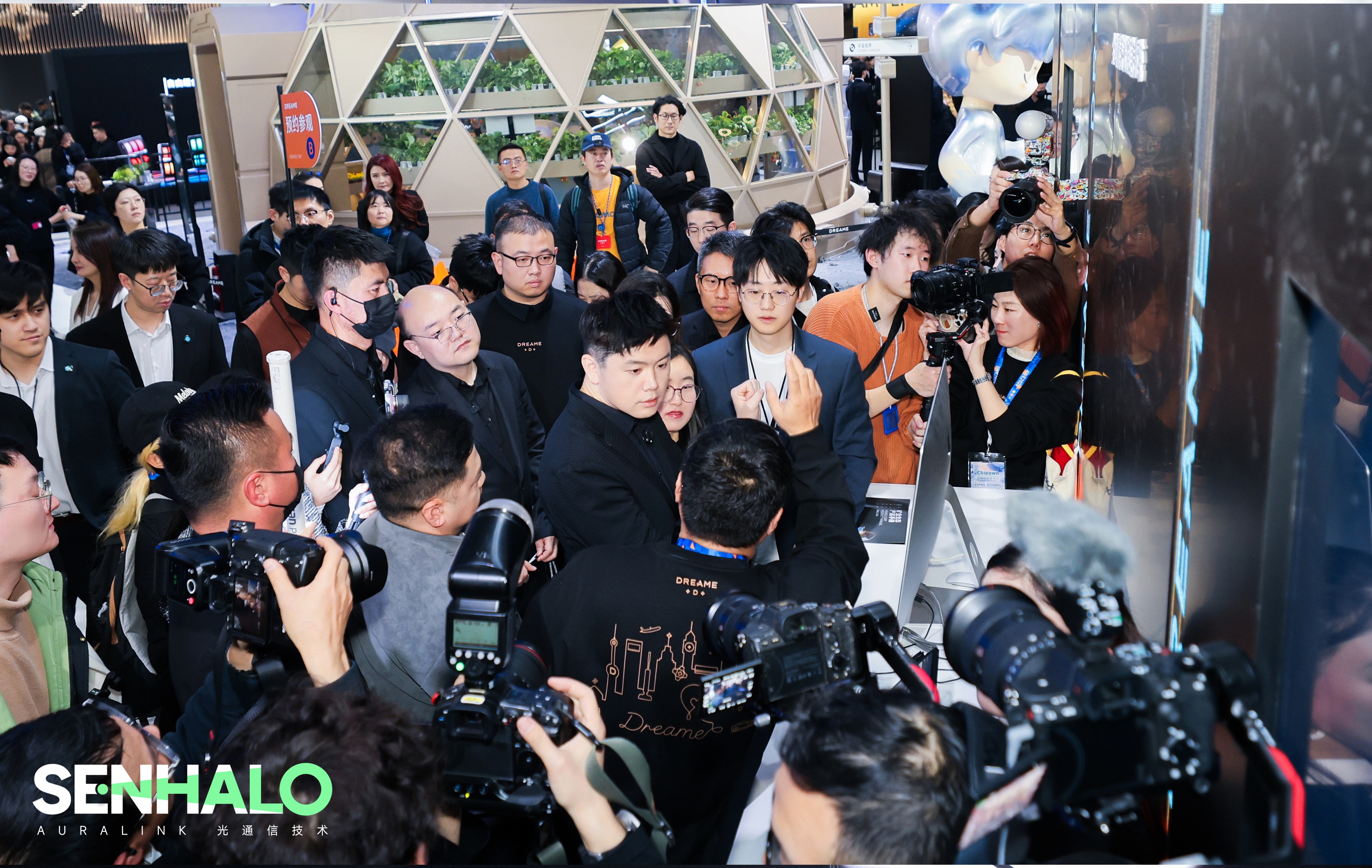 吸引他们全部注意力的,是首次重磅亮相的AuraLink光通信技术。在这里,光不仅用来照明,更化身为海量数据的“超级运输机”——只要有光,就能实现极速、无盲区、高安全的千兆级网络传输。