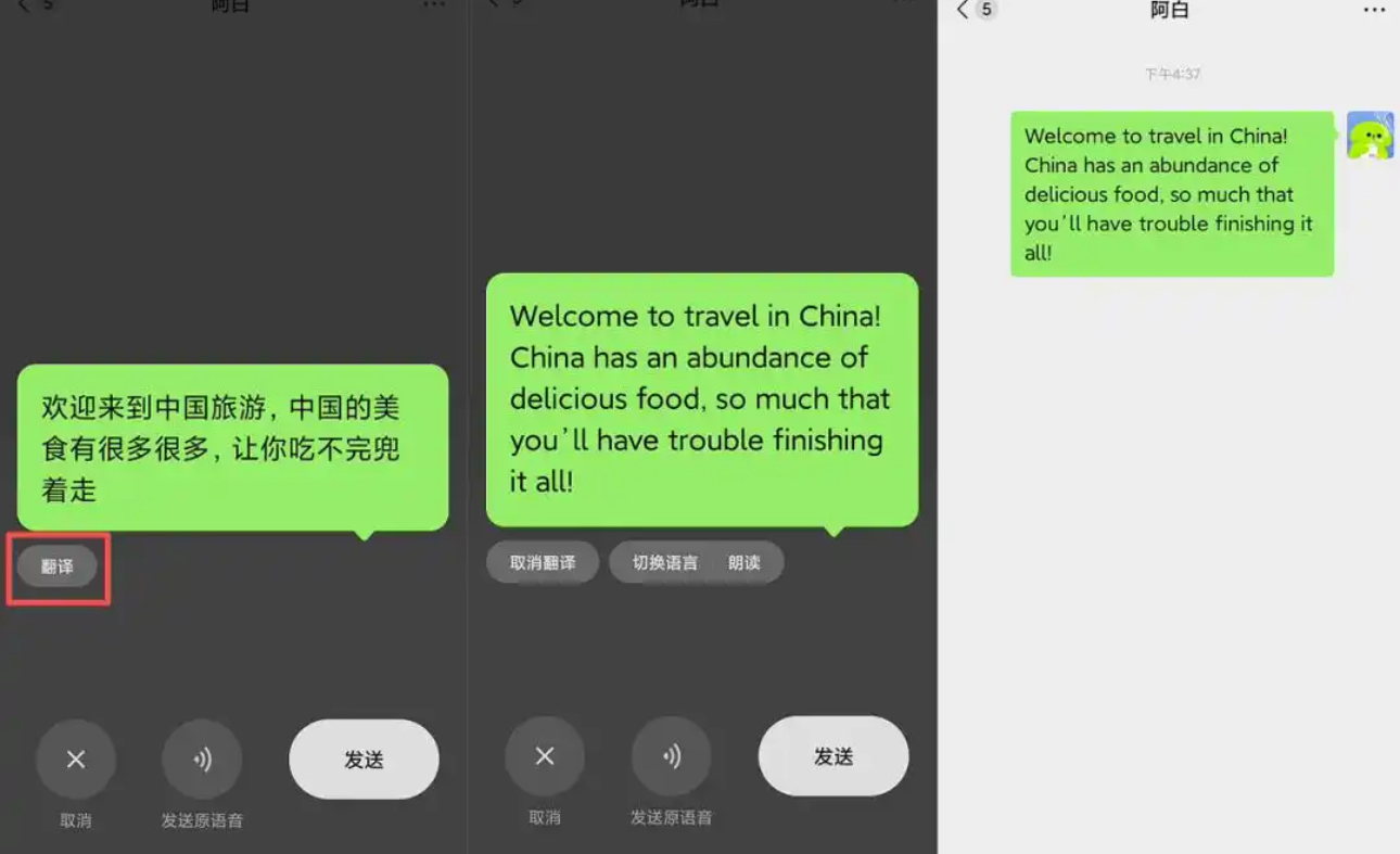 二是微信语音转文字也有了“同声传译”功能。微信聊天说完语音后,左下角点击“翻译”按钮,语音可以翻译成想要的语言。