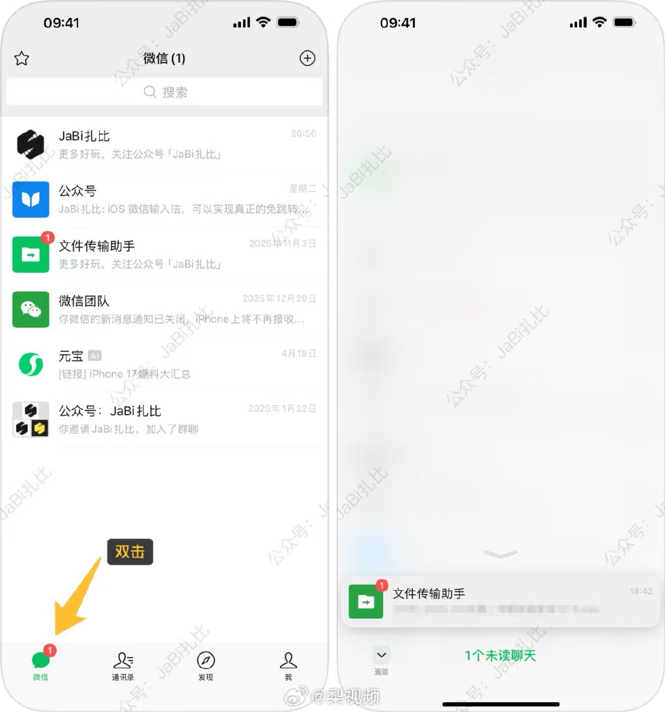此外,据梨视频报道,微信正在灰测双击标签显示所有未读。当微信有新消息时,用户习惯通过双击底部导航栏的“微信”标签项,来快速定位到该消息位置。