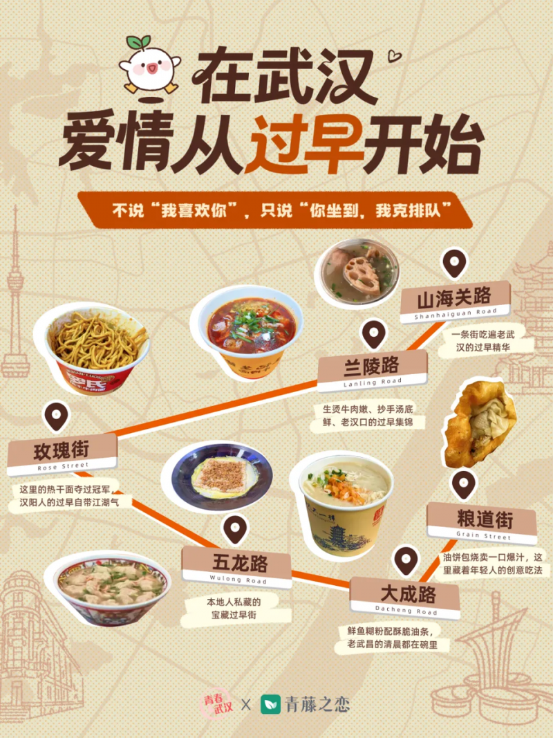 报道提到,3月4日,由青藤之恋联合团武汉市委共同制作的《武汉小众约会地图第三期·过早篇》正式上线。该地图以武汉独特的“过早文化”为灵感,设计了6条老街路线,推荐几十种地方早餐美食,为青年恋人提供一起“克过早”的约会路线,让城市烟火气成为年轻人自然相处的社交场景。