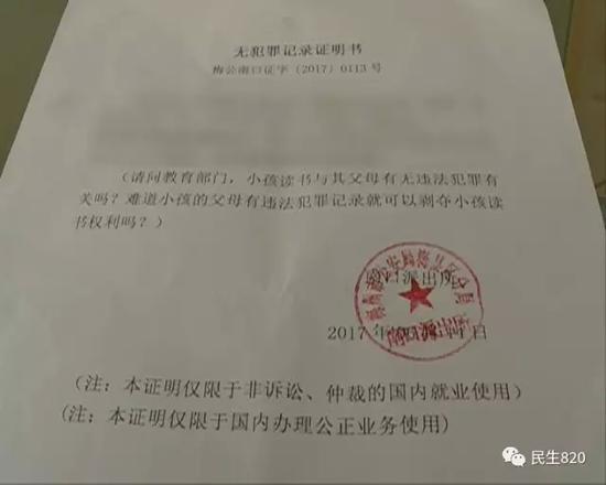 按规定,公安机关不再对个人不予出具违法犯罪记录的证明。但是碍于群众的诉求,刘先生户籍所在地派出所的民警还是无奈地给刘先生开出了证明。不过,民警在开出的证明中提了个疑问。在派出所开具的证明书的中间打了括号,里面写着:“请问教育部门,小孩读书与其父母有无犯罪有关吗?难道小孩的父母有违法犯罪记录,就可以剥夺小孩读书权利吗?”梅江区教育局则回应称,这个《申请表》已经实施了五年,不管“积分”多或少,犯罪记录怎么样,都不会影响孩子的就读,都是可以找到学位的。