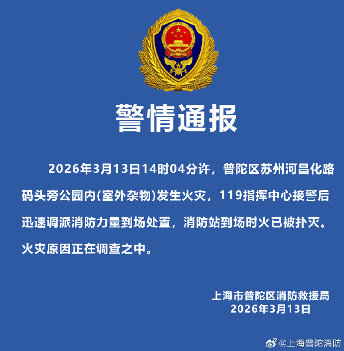 上海普陀消防通报,3月13日14时04分许,普陀区苏州河昌化路码头旁公园内(室外杂物)发生火灾,119指挥中心接警后迅速调派消防力量到场处置,消防站到场时火已被扑灭。火灾原因正在调查之中。