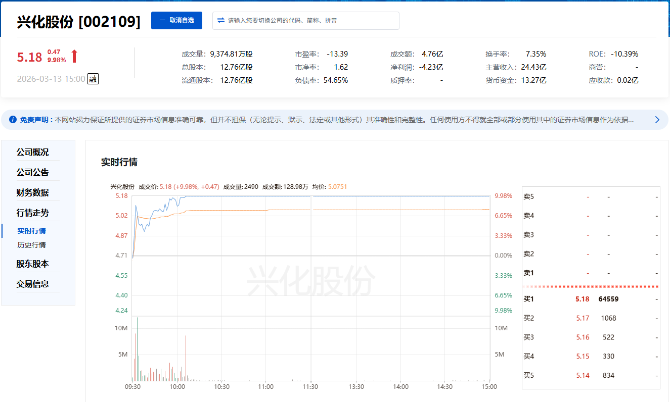 3月13日,兴化股份(002109)以放量涨停态势领涨陕西板块,其走势受板块联动、资金推动及地缘局势等多重因素影响。