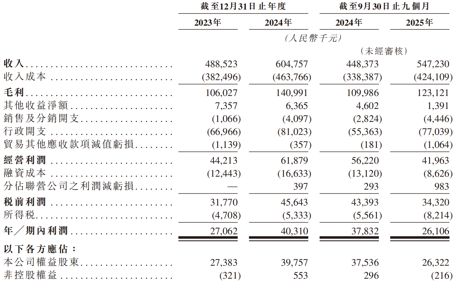 财务数据方面,2023年、2024年及2025年前九个月,锦欣康养分别实现营收4.89亿元、6.05亿元、5.47亿元,同期净利润分别为2706.2万元、4031.0万元、2610.6万元,收入较为稳定。