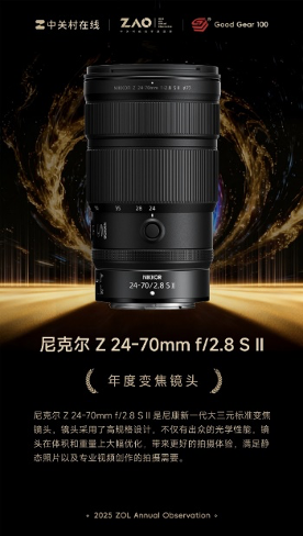 镜头产品作为影像创作的核心装备,尼康Z卡口光学产品2025年依旧表现亮眼,多款镜头在行业年度器材推荐榜单中崭露头角。尼克尔 Z 24-70mm f/2.8 S Ⅱ作为尼康2025年度重磅推出的大三元镜头力作,凭借创新内变焦设计,实现实用性与光学性能的兼顾, 成为年度器材榜单 “座上宾”。
