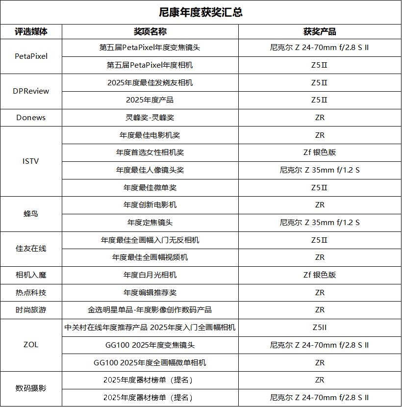 聚焦国内市场,尼康多款产品同样凭借贴合本土创作需求的功能设计与硬核产品实力,在各大专业影像及科技媒体的年度评选中表现抢眼,成为国内创作者心中的优质影像装备之选。
