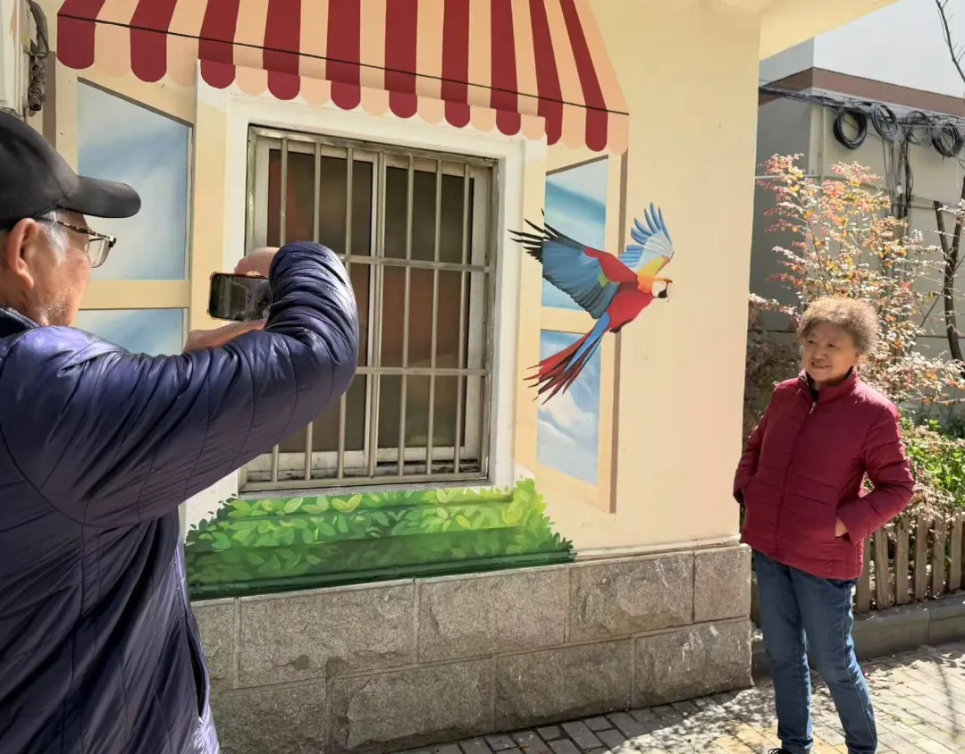 再往前走,一处社区门卫室的窗户也经过巧思设计——一只色彩斑斓的鹦鹉正“展翅高飞”,仿佛要破窗而出,充满了动感。“以前就是一面普普通通的墙,现在画得这么漂亮,每天路过心情都不一样了,特别好。”在这里住了20多年的居民孟彩英深有感触。