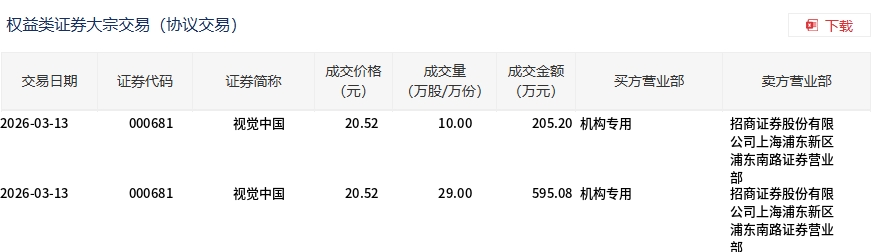 3月13日,视觉中国大宗交易成交39万股,成交额800.28万元,占当日总成交额的1.23%,成交价20.52元,较市场收盘价22.11元折价7.19%。