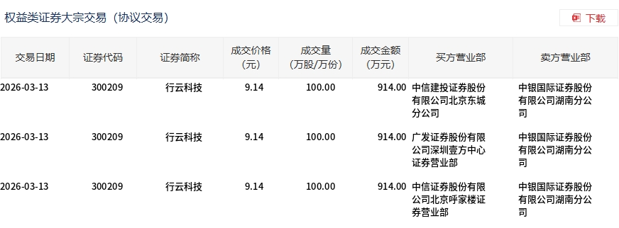 3月13日,行云科技大宗交易成交300万股,成交额2742万元,占当日总成交额的6.95%,成交价9.14元,较市场收盘价9.28元折价1.51%。