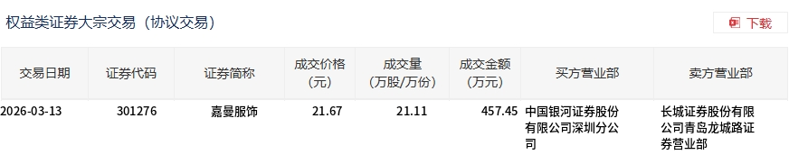 3月13日,嘉曼服饰大宗交易成交21.11万股,成交额457.45万元,占当日总成交额的8.3%,成交价21.67元,较市场收盘价26.7元折价18.84%。