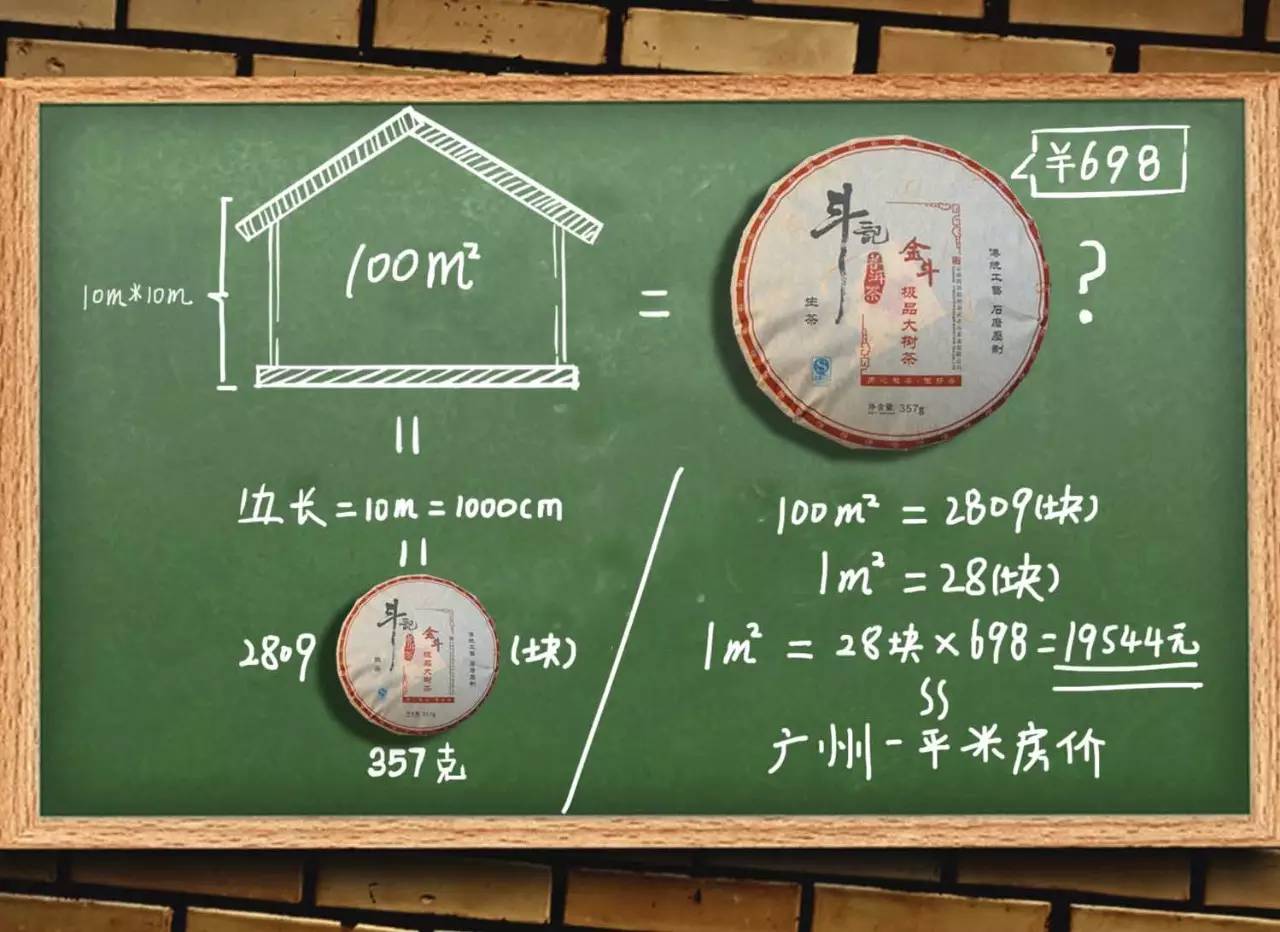 按照2016年千款茶评榜普洱茶榜首——斗记2016年金斗的价格来算,一饼698元,28块饼就是19544元,所以,一平方米的斗记1601普洱茶,快赶上广州一平米的房价了……