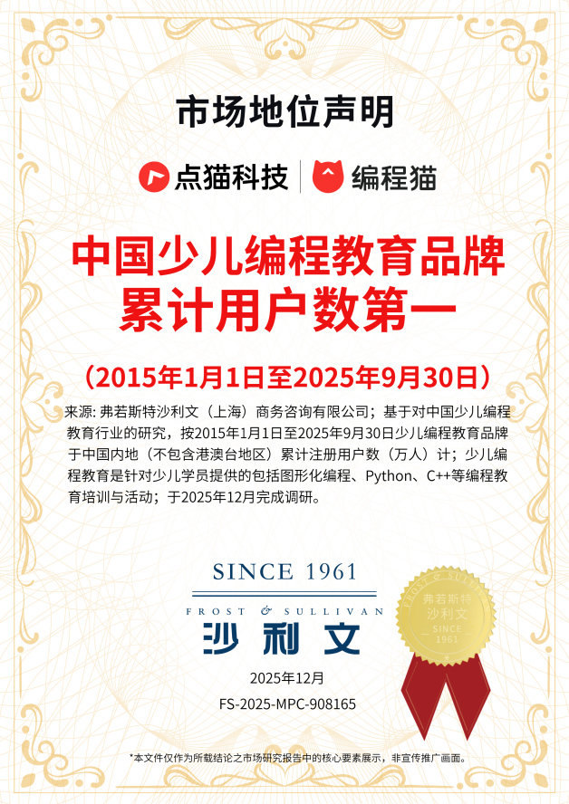 事实上,编程猫之所以能脱颖而出,源于其在国内少儿编程赛道上罕见的“全栈自研”能力。成立于2015年的点猫科技,是国内少儿编程在线教育的开创者,不同于许多依赖开源工具或国外平台的机构,点猫科技早在成立之初便坚持底层代码自主可控,累计获得多项技术专利,技术实力稳居行业前列。截至目前,编程猫已构建了覆盖“软件工具 - 课程内容 - 师资培训 - 应用场景”的完整AI教育生态。根据公开数据显示,其服务注册用户数超4300万。这种规模化落地的能力,为北大的科研成果提供了广阔的“试验田”和反馈机制。
